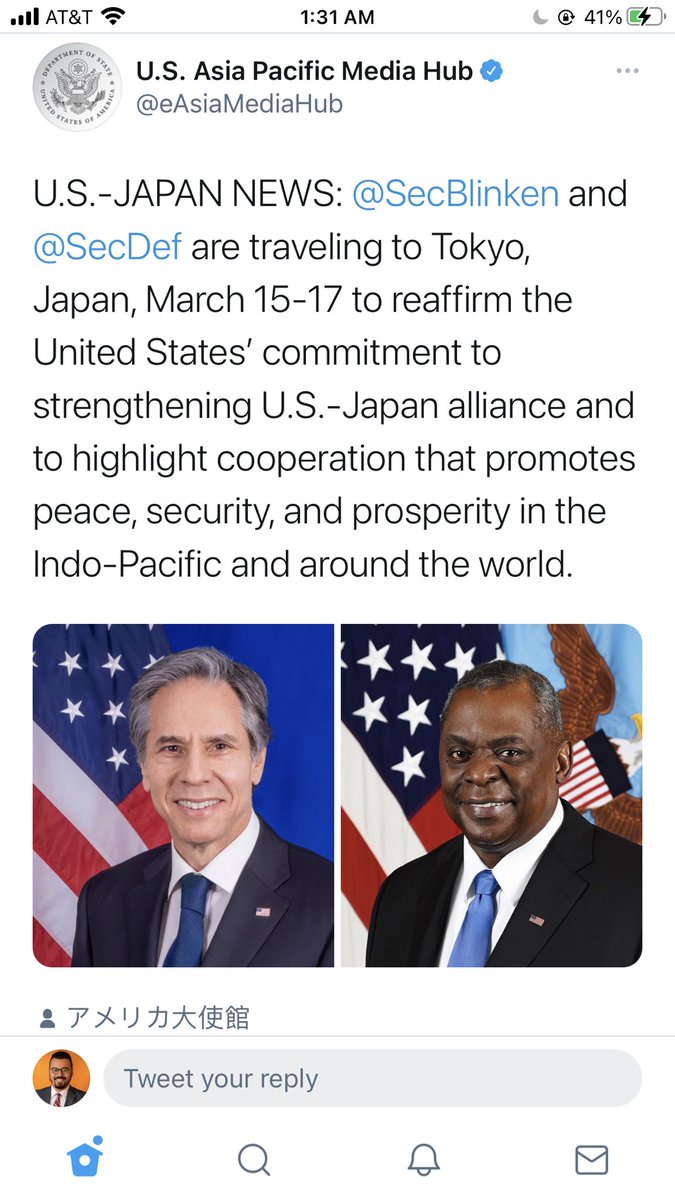 مقاله الوزيران تحدثت عن اولويات اداره بايدن للتعاون مع الحلفاء في الإندو-باسيفيك. و يشدد الوزيران ان امريكا يمكنها تحقيق الكثير من اهدافها الاستراتيجيه (الصين/ كوريا الشماليه) من خلال شبكه تحالفاتها.