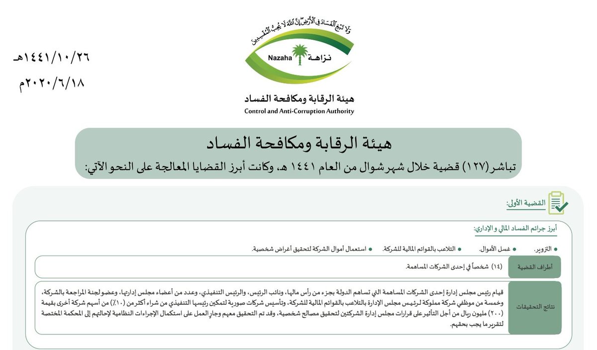 هنا قضية فساد وغسل اموال با 200 مليون ريال #هيئة_الرقابة_ومكافحة_الفساد استخدم فيه شركة ظل يعتبرهذا النوع الاكثر انتشاراً