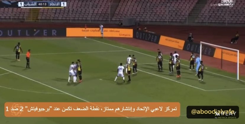 ▫️ولو نلاحظ أن [ تمركز لاعبي #الاتحاد ] يعتبر ممتاز، في تطبيق رقابة الرجل لرجل، إلا في منطقة "بريجوفيتش" حيث يضم "سيبا" لاحقًا ليعمل حاجز على بريوفيتش ثم ينطلق "ايغور" دون رقابة..