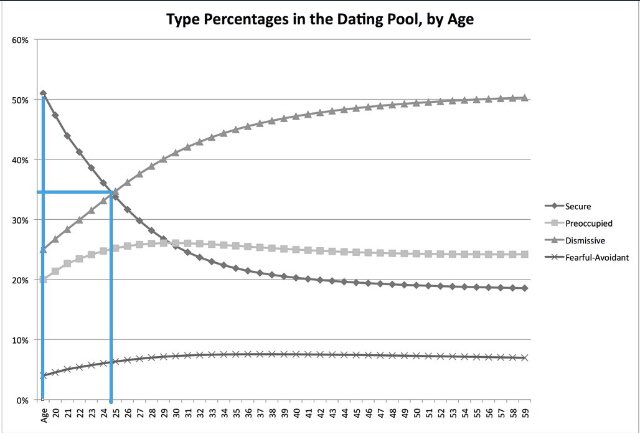 -وترتفع احتمالية الحصول على شريك نمطه تجنبي من 25% إلى 35% (الذي يبدأ العلاقات وينهيها بسرعة)