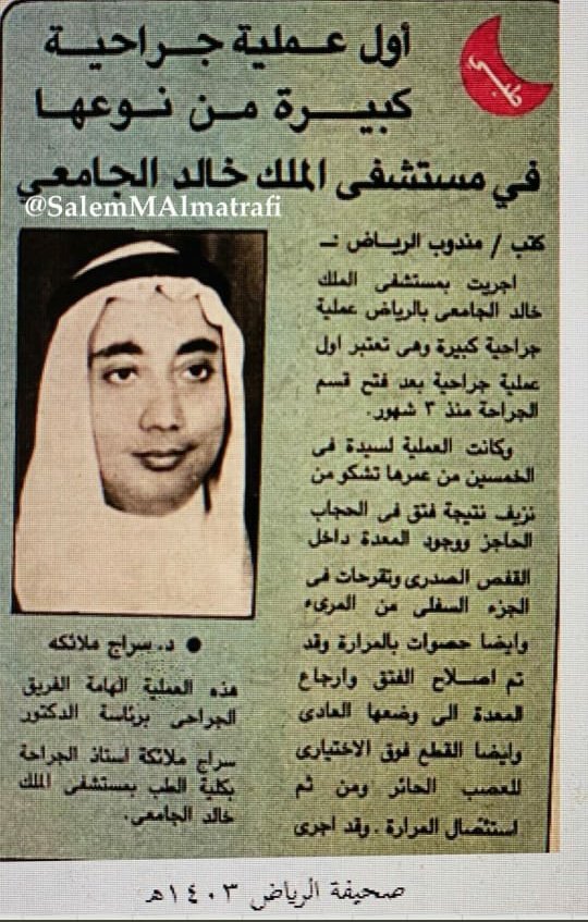 6️⃣ولا تقبل التدخل الجراحي لوجود مضاعفات متعددة، فتدخل الدكتور المخلص سراج وقال (ما دام هناك نفس) سنجري له العملية و أصر أن يتولى الحالة بنفسه، وكتب الله على يديه النجاح فخرج من غرف العمليات وهو مستبشر مسرور يردد الشكر للمولى بأن ساعده في هذه العمليه المعقدة والصعبة