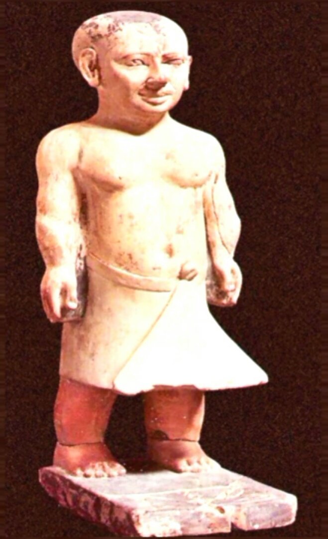 2-يعود لعصر الدولة القديمة وبالتحديد لعصر الأسرة الخامسة التي حكمت خلال الفترة(2494-2345 ق.م)"خنوم حتب" شغل كل تلك المناصب وهو قزم ومثله الفنان المصري القديم أيضا في هيئته الطبيعية كقزم دون حرج أو استحياء فتم تمثيله بجذع كبير بشكل مبالغ فيه بما لايتناسب مع ساقيه وذراعيه القصيرين