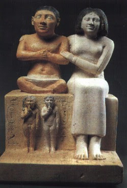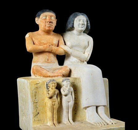 4-ومن بين التماثيل الفريدة عندنا مجموعة القزم "سنب"وعائلته وجد داخل مصطبته الجنائزية بالجيزة وهى أول مقبرة لها سقف على شكل القبة وغرف دائرية تمثال من الحجر الجيري الملون التمثال يُصور سنب جالساً بأرجل متدلية و بجانبه زوجته تعانقه بمودة (يدها على كتفه) وزوجته طبيعية الطول ♥👇