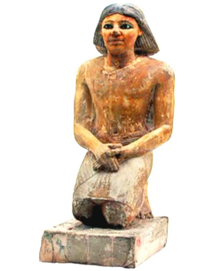 7-وهناك أيضا تمثال للكاهن "ما إم قد" وهو منحوت من الحجر الجيرى بارتفاع 43 سم وقد عثر عليه مع بعض تماثيل للخدم فى سرداب مقبرة تخص أحد كبار الأفراد فى سقارة وهو يمثّل صاحبه راكعًا على ركبتيه بينما يضع يديه فى حجره، إحداهما فوق الأخرى 👇