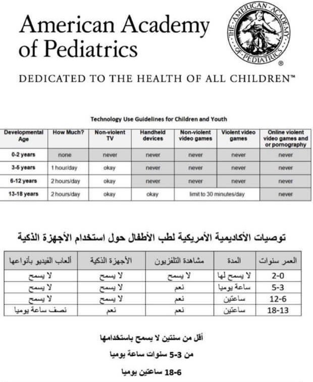 ومن ٦ سنوات الى ١٢ سنة مسموح لهم لمدة ساعة فقط بحسب توصيات الأكاديمية الأمريكية لطب الأطفال