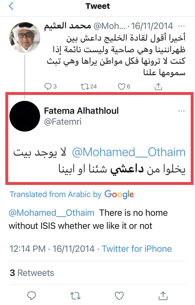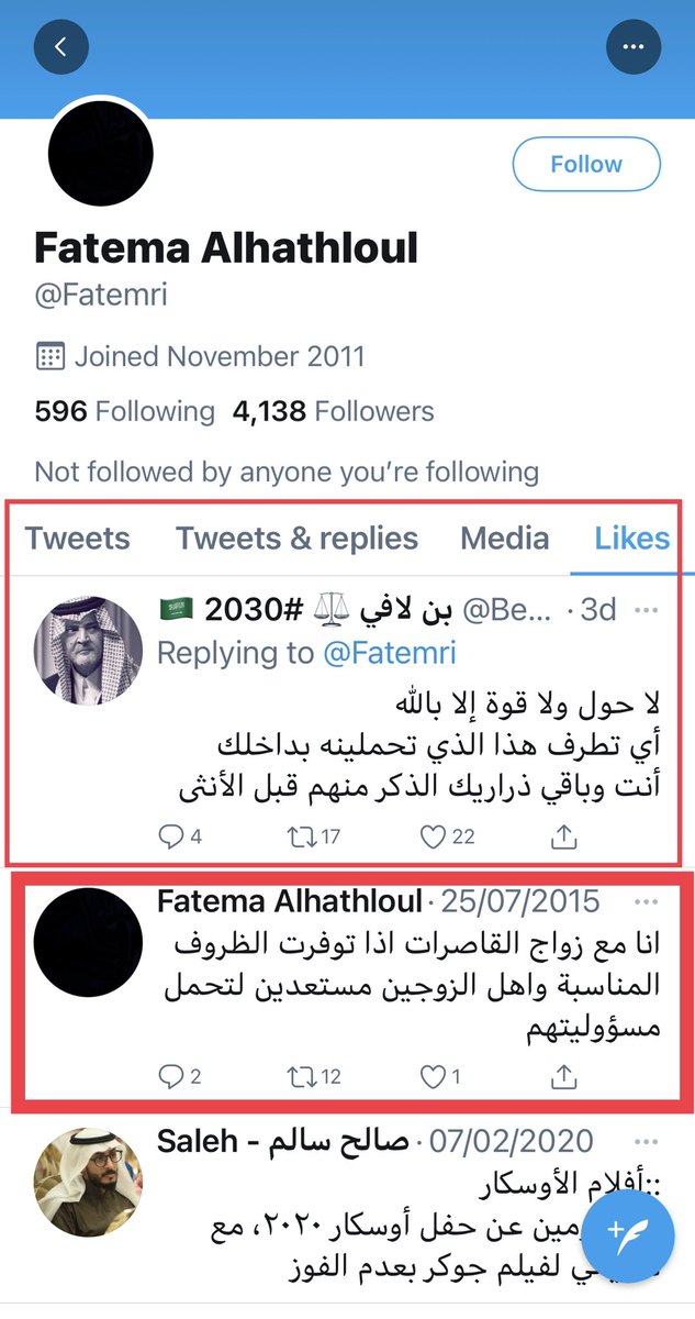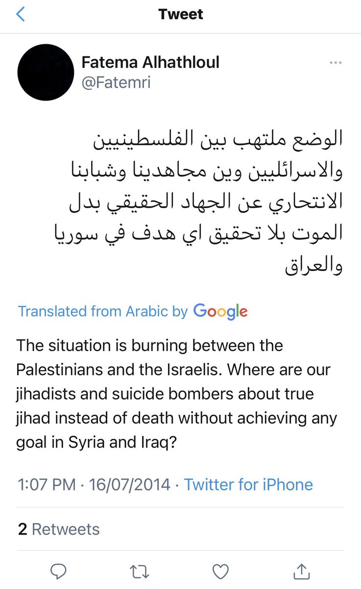 فاطمة الهذلول @Fatemri لم تتراجع عن تغريداتها المتطرفة والداعمة للإرهاب، يظهر من مفضلة حسابها بأنها تتابع كل مايجري!