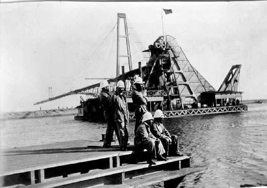 صندل لتخليص السفن الشاحطة بقناة السويس أمام الإسماعيلية، 11 فبراير 1903، خلف تيودور هرتسل والوفد الصهيوني الذي كان يتفاوض مع رئيس الوزراء المصري بطرس غالي واللورد كرومر على استئجار سيناء لمدة 99 سنة.