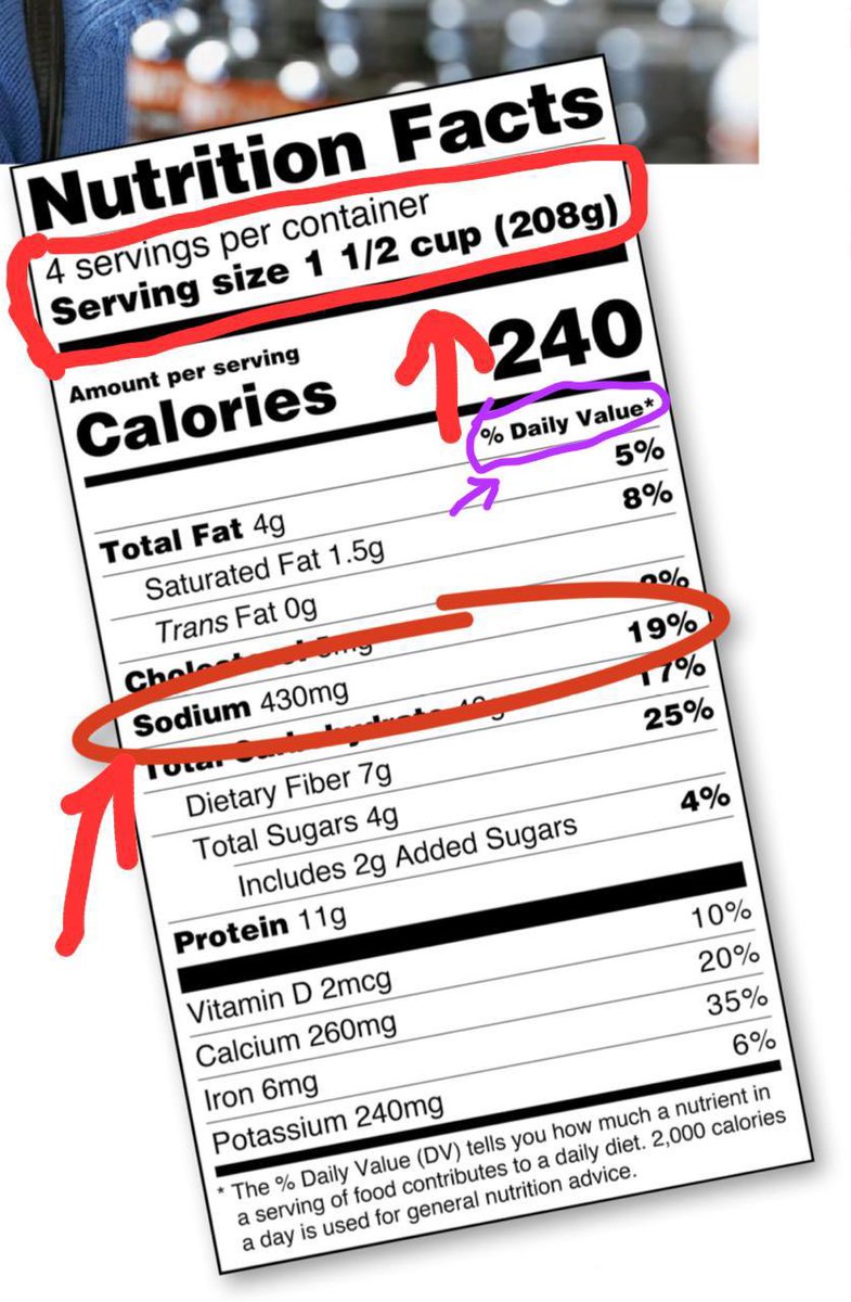 9️⃣ الصورة المرفقة توضح بطاقة غذائية لمنتج به ٤ حصص في العبوه الواحدة..ولكن كل الارقام في جدول البطاقة الغذائية تكون لحصة واحدة فقط..وهذا يعني لو ان الشخص تناول العبوه كامله فهو تناول ٤ حصص وبالتالي يضرب الارقام الواردة في الجدول x ٤ ليعرف كمية العناصر التي تناولها ومنها الصوديوم