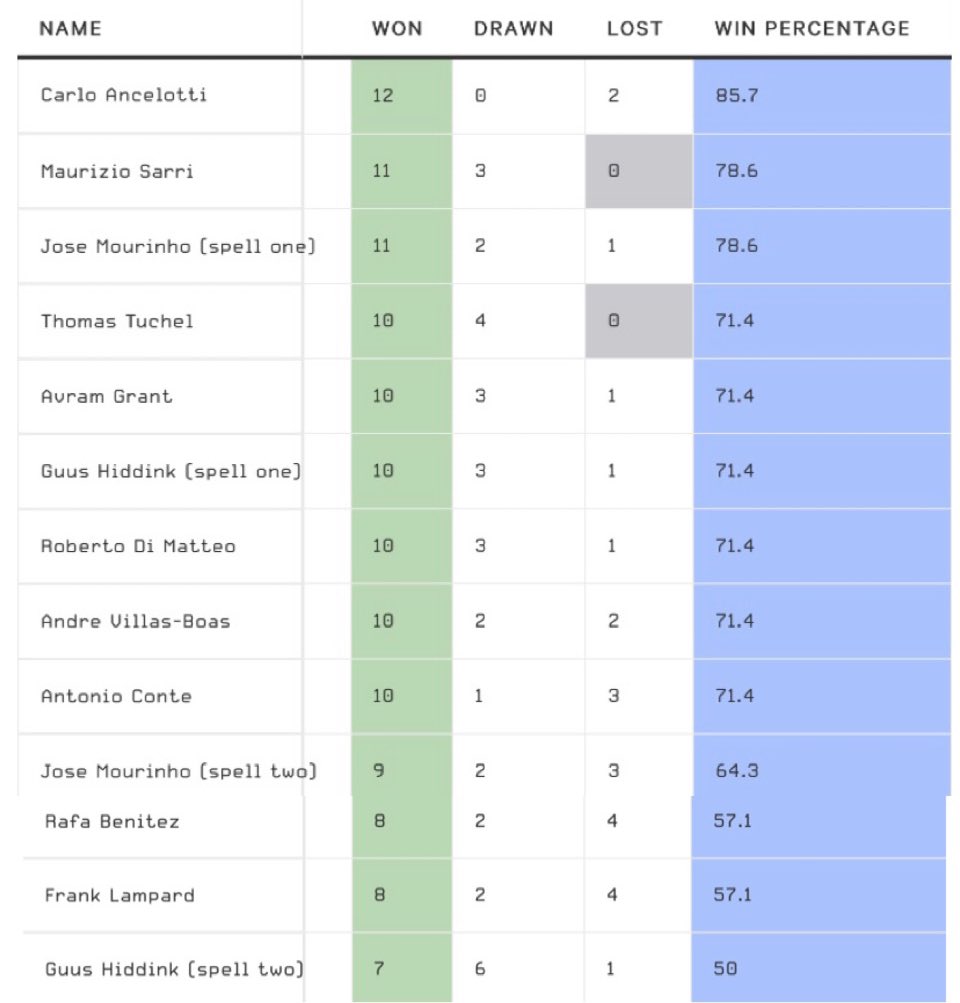 وهذا هو السبب في أن ماوريسيو ساري هو الرجل الآخر الوحيد مع توخيل في الترتيب مع سجل بدون هزيمة (لأن خسارته الوحيدة يعتبرها الكثيرون مباراة ودية قبل الموسم 2-0 ضد مانشستر سيتي في عام 2018). سجل كارلو أنشيلوتي لا يزال كما هو (بغض النظر عن فوزه بالدرع الخيرية لعام 2009).