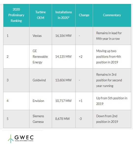وحققت شركة Envision الصينية تقدم كبير مقارنة ب2019 وذلك بسب النمو القوي لقطاع الرياح في السوق الصيني (تركيب أكثر من 10 جيجاوات في 2020) وسنتاول التقرير لاحقا