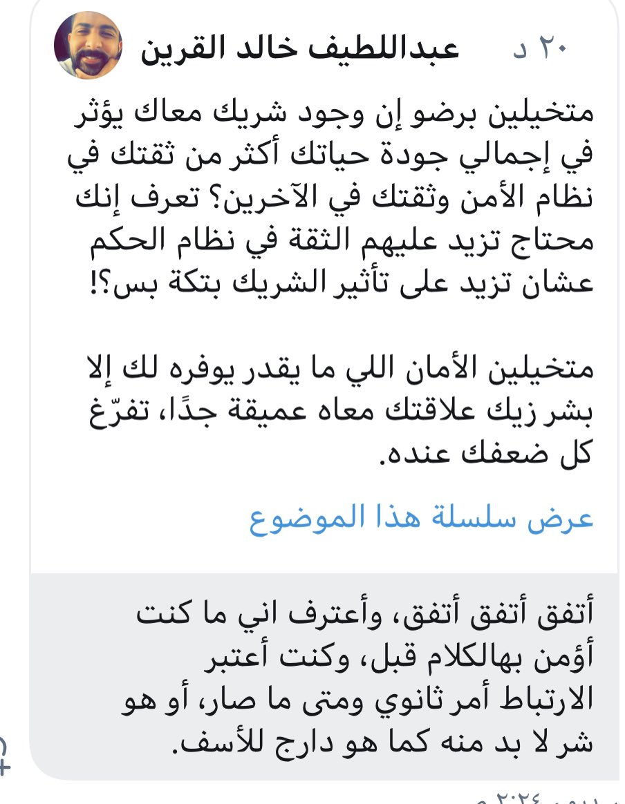 الفكرة إننا نعرف أهميّة الشريك تفوق العوامل الأخرى المذكورة نبدأ نفهم إن العلاقة أولى بالاجتهاد من رفع المدخول اللي نتحمّل فيه كرف المدير وعدم التفاهم ونداوم زي الألف عشانه. بينما ما عندنا لياقة نتعب ونتحمل شركاءنا رغم إن تأثير وجودهم بحثيًا أعلى من (المدخول المرتفع).