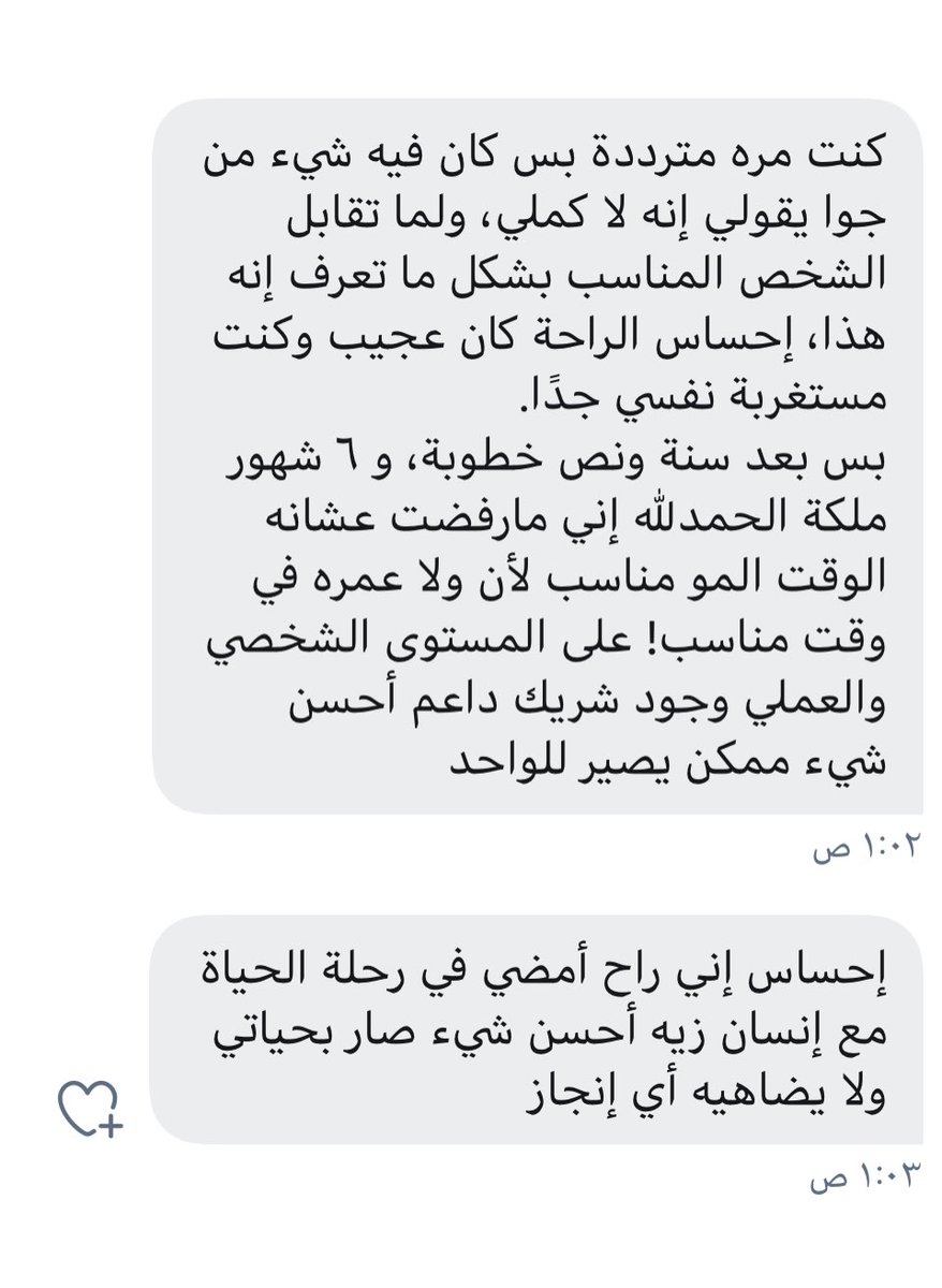 ولعلّي أختم هنا، لا مانع من الزواج في عمر مبكر، لا مانع من الزواج قبل ضمان الوظيفة بالنسبة للنساء، اكتبوا شروطكم في العقد بعد أن تتأكدوا من تفكير شريككم وانطلقوا.