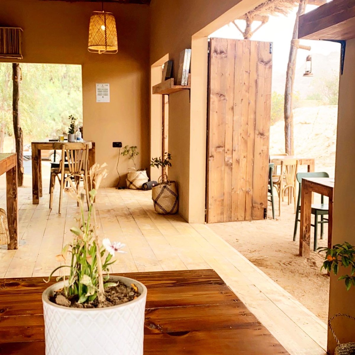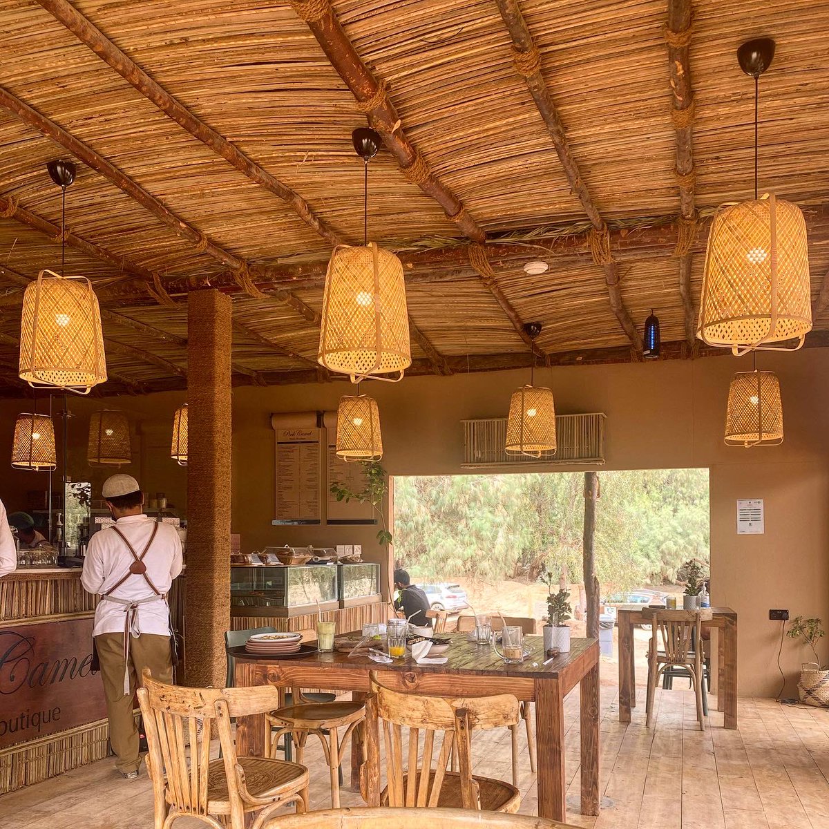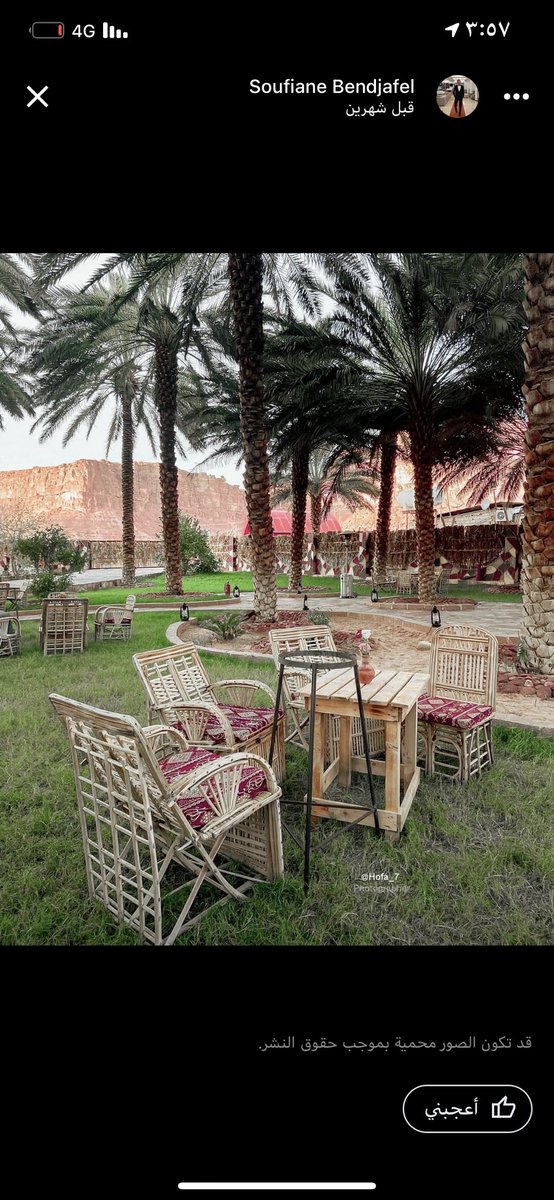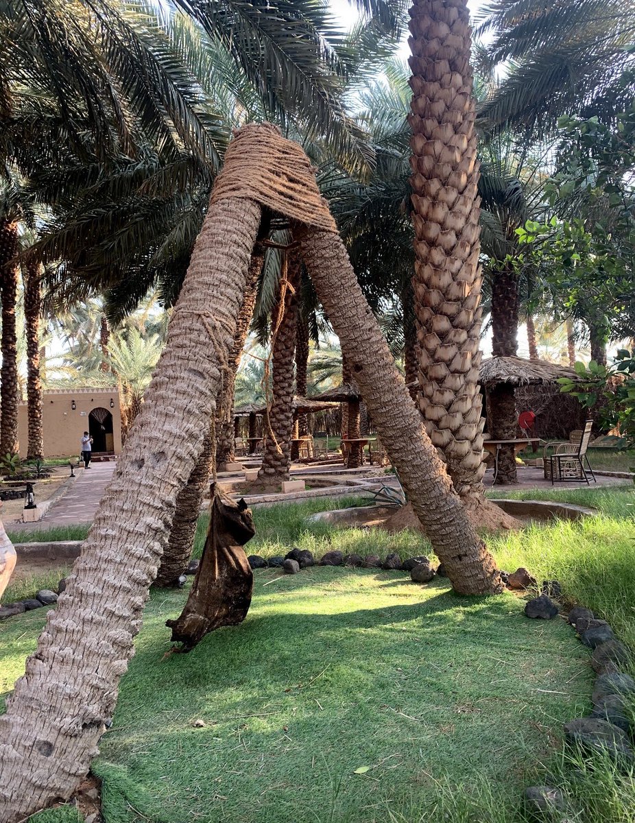 ▪️المكان جميل جدا ورايق عباره مزرعة نخيل والاشجار في كل مكان ، بها جلسات متنوعة بين النخل سواء طاولات او ارضية او اكواخ بالسعف