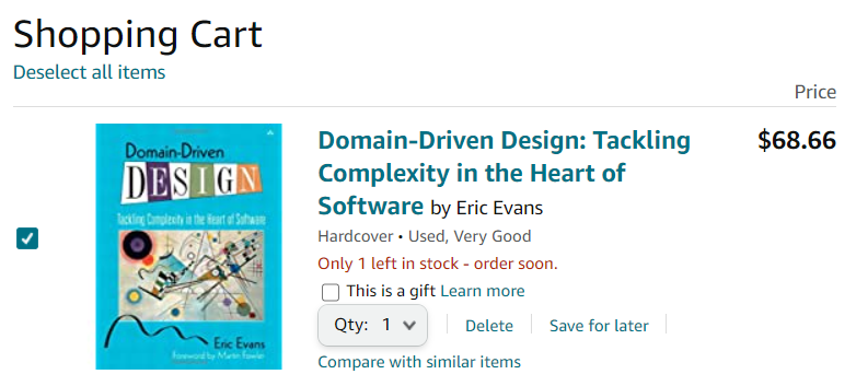وضعت امام الShopping Cart علامة استفهام. لانه من الممكن ان تكون ValueObject إذا لم نكن مهتمين بحفظها في قاعدة البيانات كـCart و انما مهتمين بحفظها بعد أن تصبح Order فقط. لكن من الأفضل معاملتها ليس فقط كـEntity و انما كـ Aggregate Root.