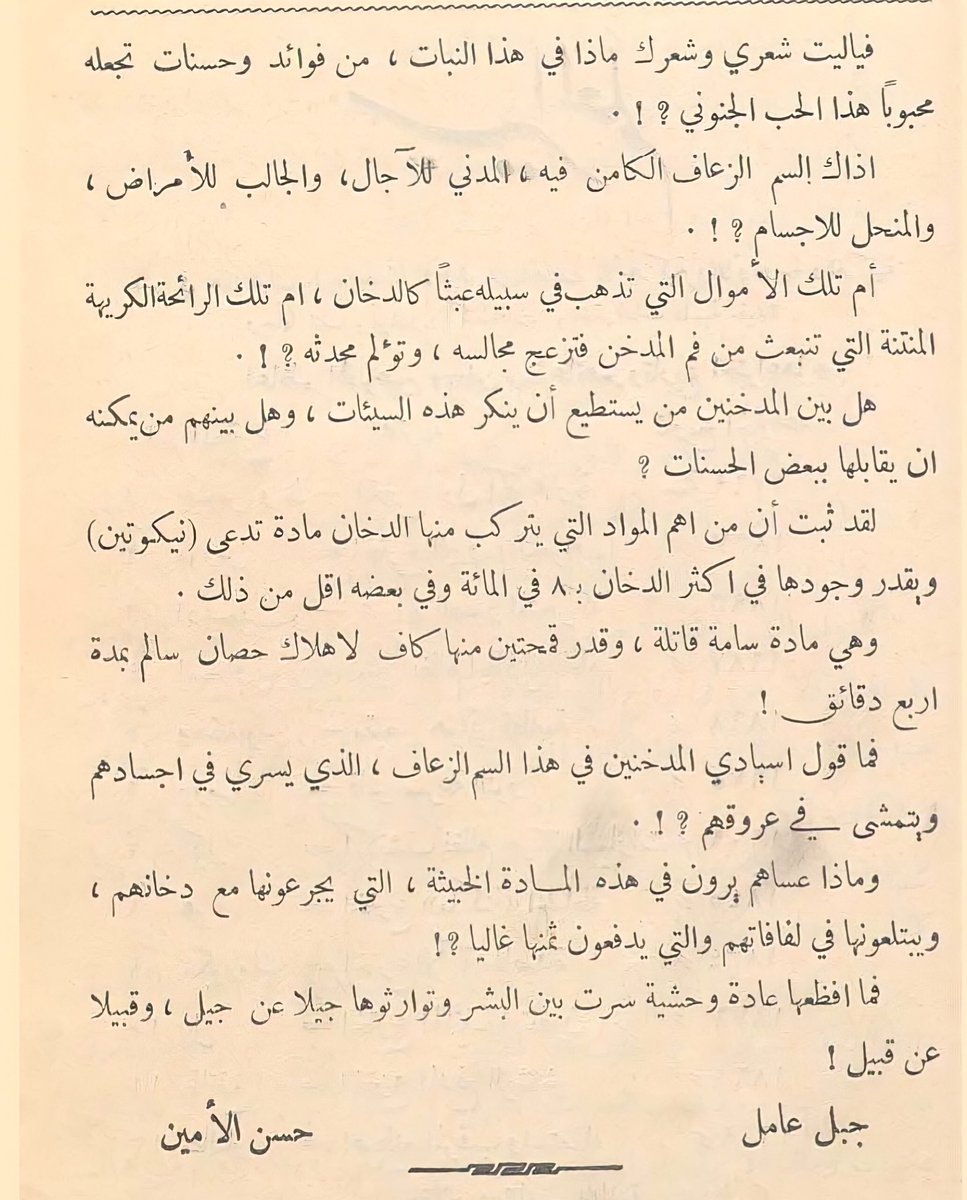 ومن طريف قوله ما ذكره عن شعوره بالخوف والضيق إذا زار بيتاً يخلو من «منافض = طفايات» السجائر. لأن هذا البيت تكون الغرف فيه نظيفة إلى حدٍّ لا يطاق، مغالية في تنظيمها، كما تكون الوسائد فيها في أماكنها الصحيحة، ويكون الناس فيه جد مستقيمين، وخالين من كل عاطفة!