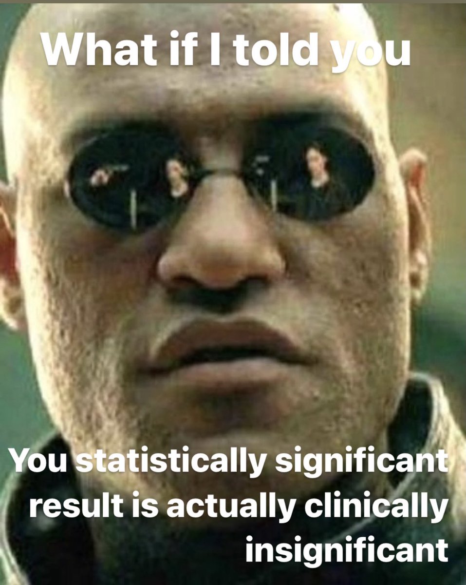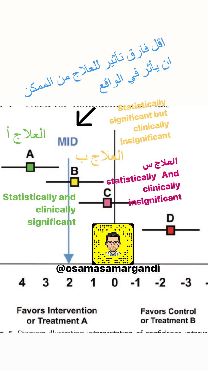 (٦/٦) واخيرا نستنتج ان ليست كل قيمة p-value اقل من 0.05 نقرأها في الأبحاث مهمه او تعني شيء في الواقع. الدراسة المؤثرة تحتاج تخطيط مسبق لتحديد اقل فائدة يمكن قبولها من العلاج لقبول استخدامه او نقله الى مرحلة تجارب اعلى. وهذا ليس سهل! انتهى @rattibha
