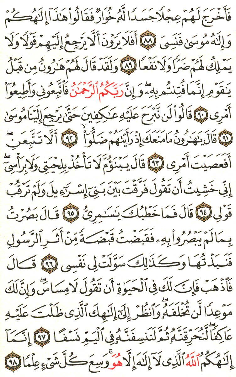 وعند انتهائه من صنع العجل نبذل مافي يده من اثر الرسول التراب وراو ان العجل يتحرك فعبدوه واخبرهم ان نبي الله موسى قد نسي وذهب الى الاله الغلط وان هذا العجل هو ربه وهذا ماقامو بمخالفت النبي واستوقاح علني منهم وبرائت النبي هارون من اعمالهم وراس الفتنه واعتيادهم