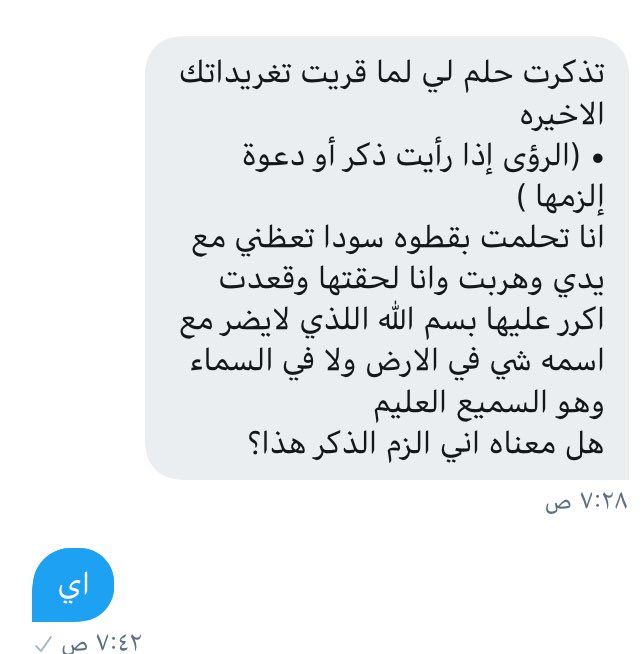 • الرؤى إذا رأيت ذكر أو دعوة إلزمها ،وإذا فعل أفعلها ( بشرط:أن لاتُخالف الكتاب والسّنه)لأنّ مدخل الشيطان من هذا الباب واسع .