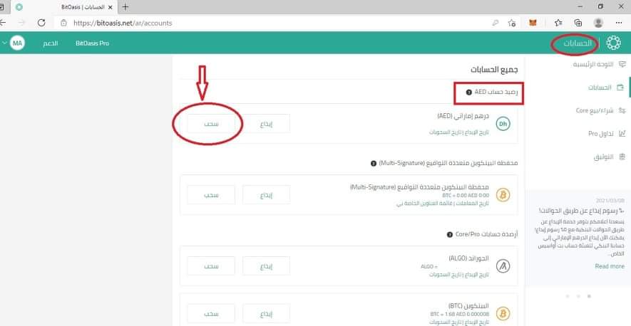 بعد تسجيل الدخول نذهب إلى قائمة الحسابات - رصيد الدرهم الإماراتي ثم نختار سحب