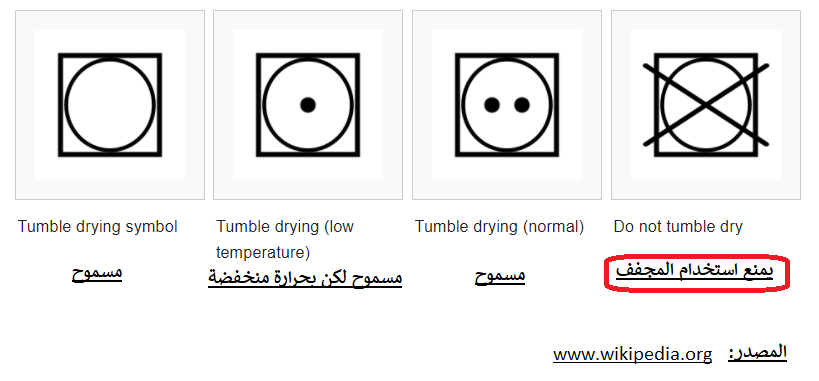 قبل و ضع الملابس في المجفف لا بد من التأكد من صلاحية هذه الملابس للاستعمال في المجفف.
