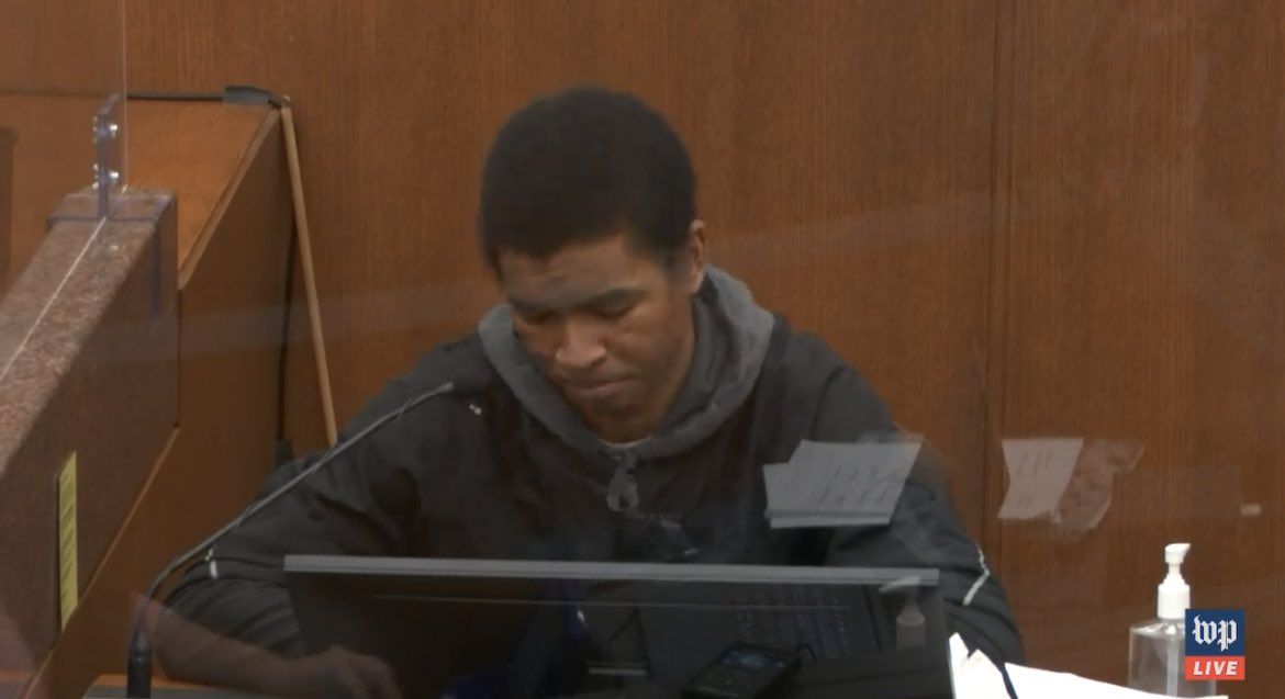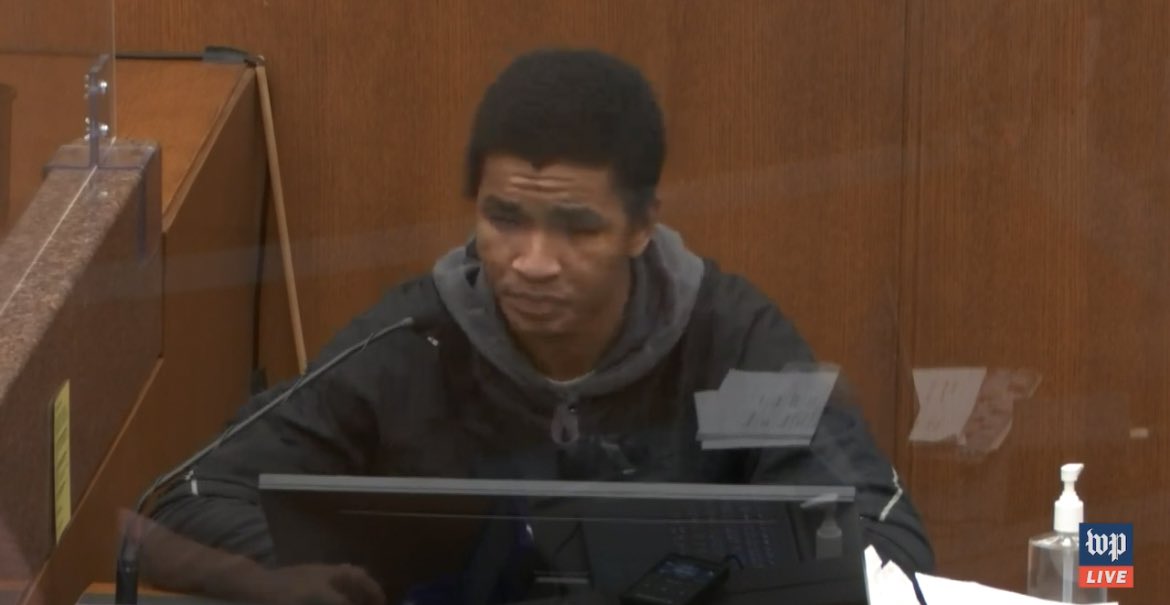 احد شاهدين الادعاء يبكي على المنصة عند مشاهدته الفديو ، والقاضي يوقف الجلسة مؤقتًا.
