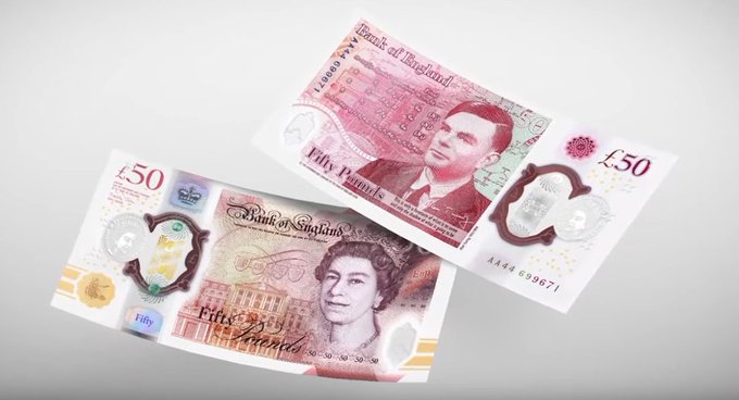 كشف البنك البريطاني المركزي عن تصميم الورقة النقدية الجديدة لفئة 50 جنيه إسترليني، وهي الورقة الأكثر أمانًا حتى الآن، وتضم صورة لعالم الرياضيات ورائد الكمبيوتر ومشفر الرموز آلان تورينغ.