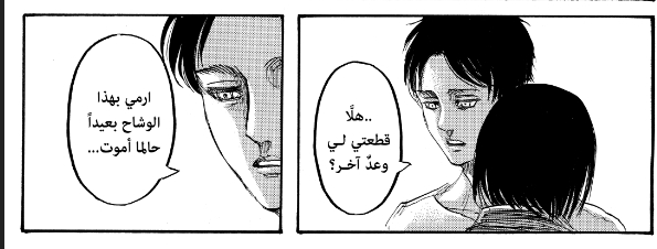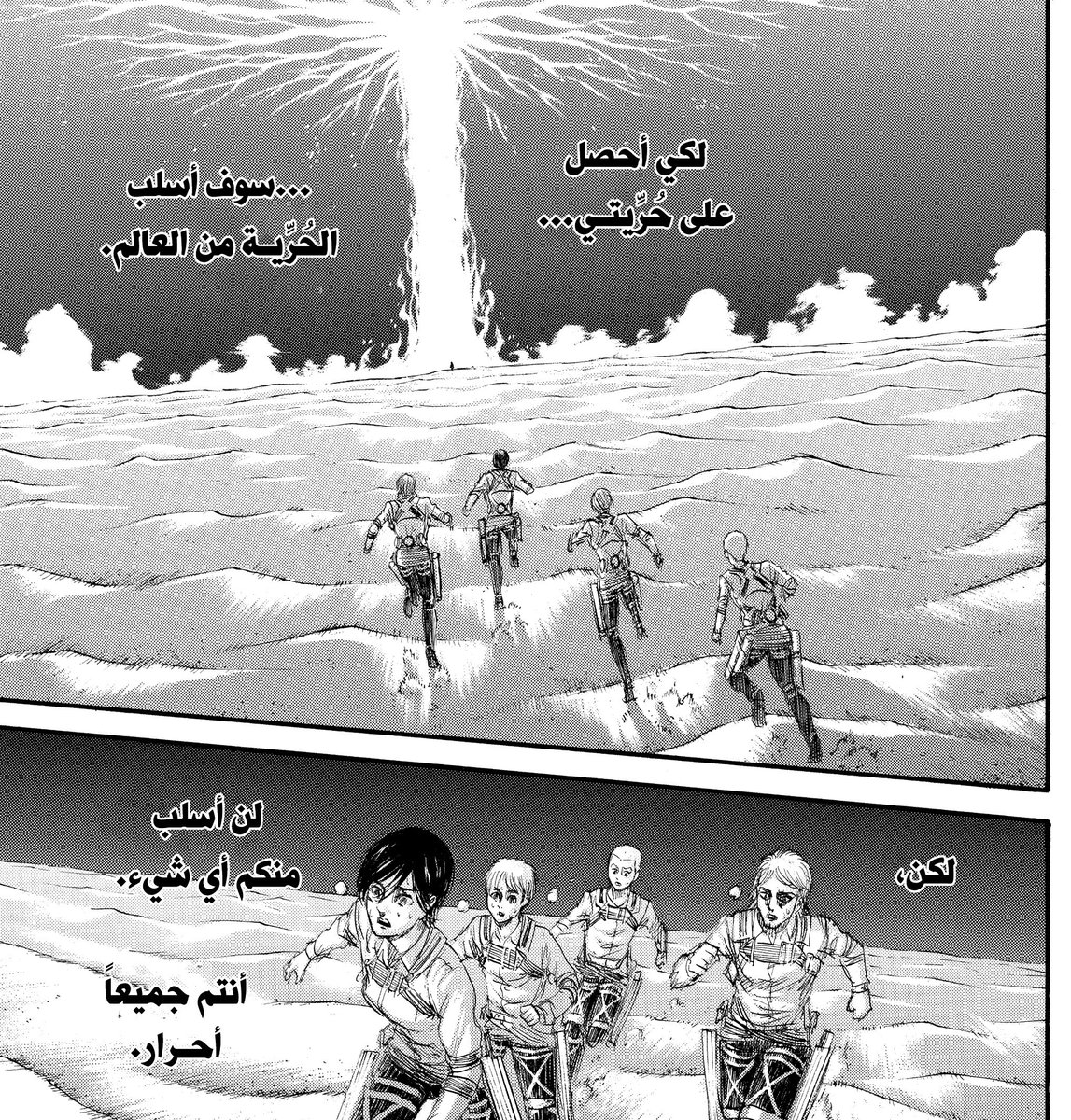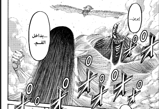 أ- حرص ايرين على عدم قتل اصدقائه، ففي النهاية هو من صرح بأن لهم الحرية في قتاله في الفصل ١٣٣، لم لا نعيد صياغة ذلك الحوار حتى يناسب الاحداث الحالية؟