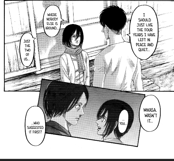 أنا أعطف عليها لأن في نظري، ميكاسا من بعد الفصل ١١٢ و هي تظن بأن إيرين ضائع و تحاول إسترجاعه مهما حصل،
