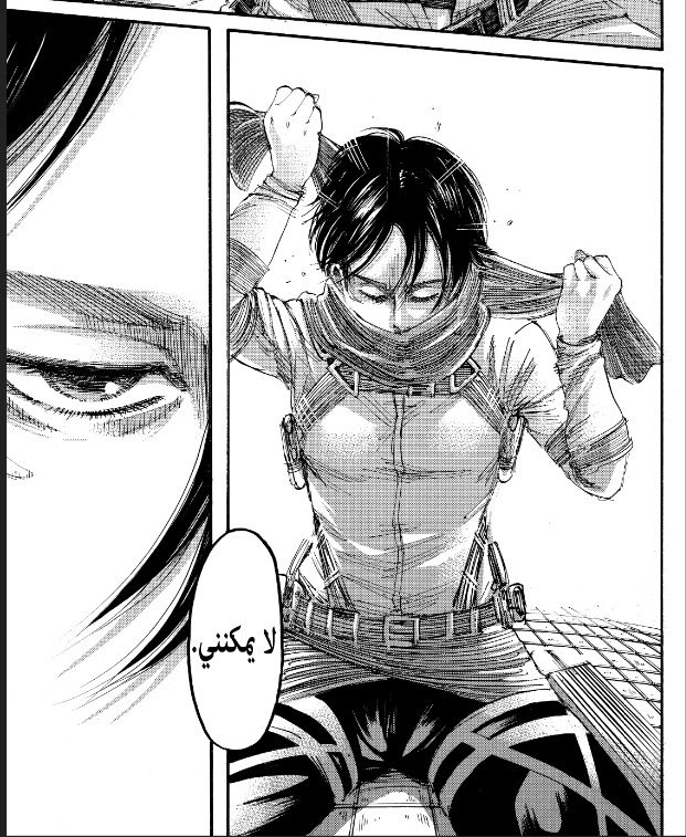 شخصية ميكاسا بدأت تثير اهتمامي من بعد هذه الصفحة، لأنها لأول مرة في القصة (على حد علمي) تعبر عن مبادئها كإنسانة مستقلة و تعترض على فعلة ايرين. و مين يلومها طبعا، مو اي احد يقبل الابادة بسهولة. حتى حنا يالقراء مازلنا متفرقين في هالنقطة.