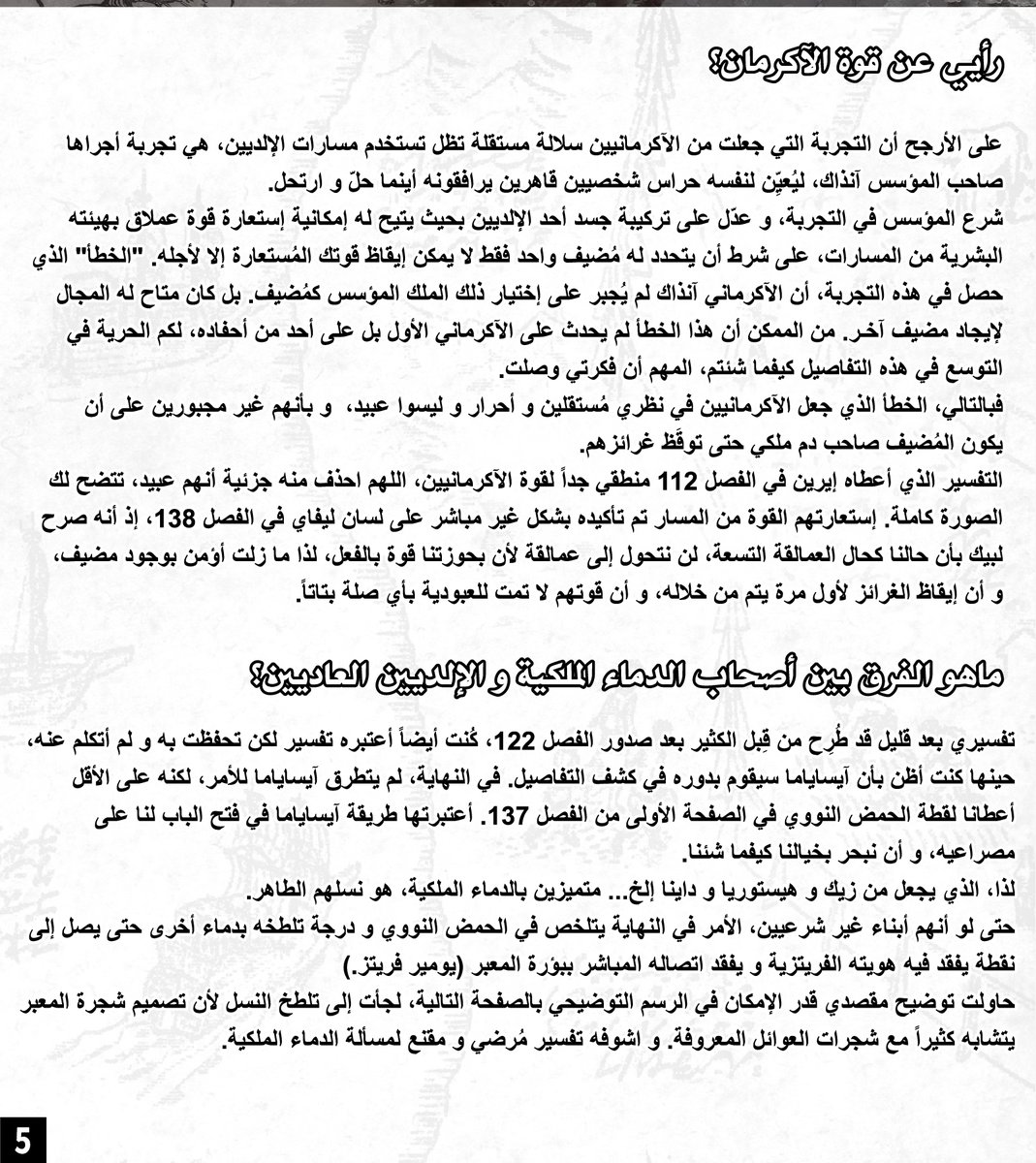 جزء لم يتسنى لي التوسع فيه بالتحليل هو قوة الآكرمان، لكني باختصار اعتبرهم غير عبيد، بل يستطيعون بحريتهم اختيار حماية المضيف أم قتله. و هذا هو "الخطأ العرضي" بذاته الذي أنتج عشريتهم، لو توفر وقت قبل نزول التسريبات ممكن أتوسع حول هذا الموضوع.