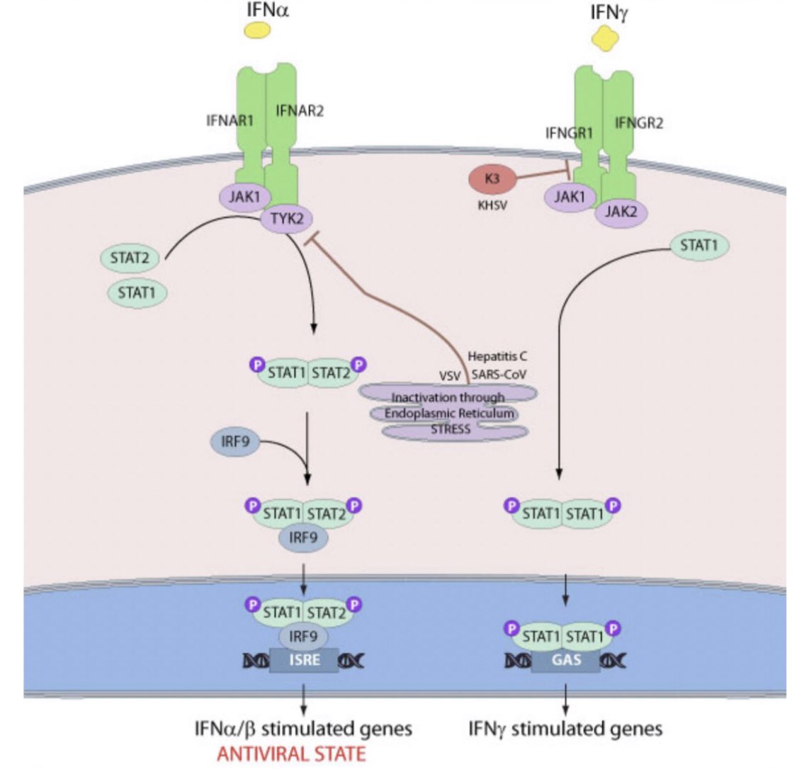 يقوم بتحفيز الخلايا المصابة بفرز بروتينات وذلك لايقاف اي مستوى من مستويات التضاعف التي يقوم بها الفايروس خلال دورة النسخ/التضاعف، ايضا يحفز الخلايا القريبة من الخلايا المصابة لمنع الفايروس