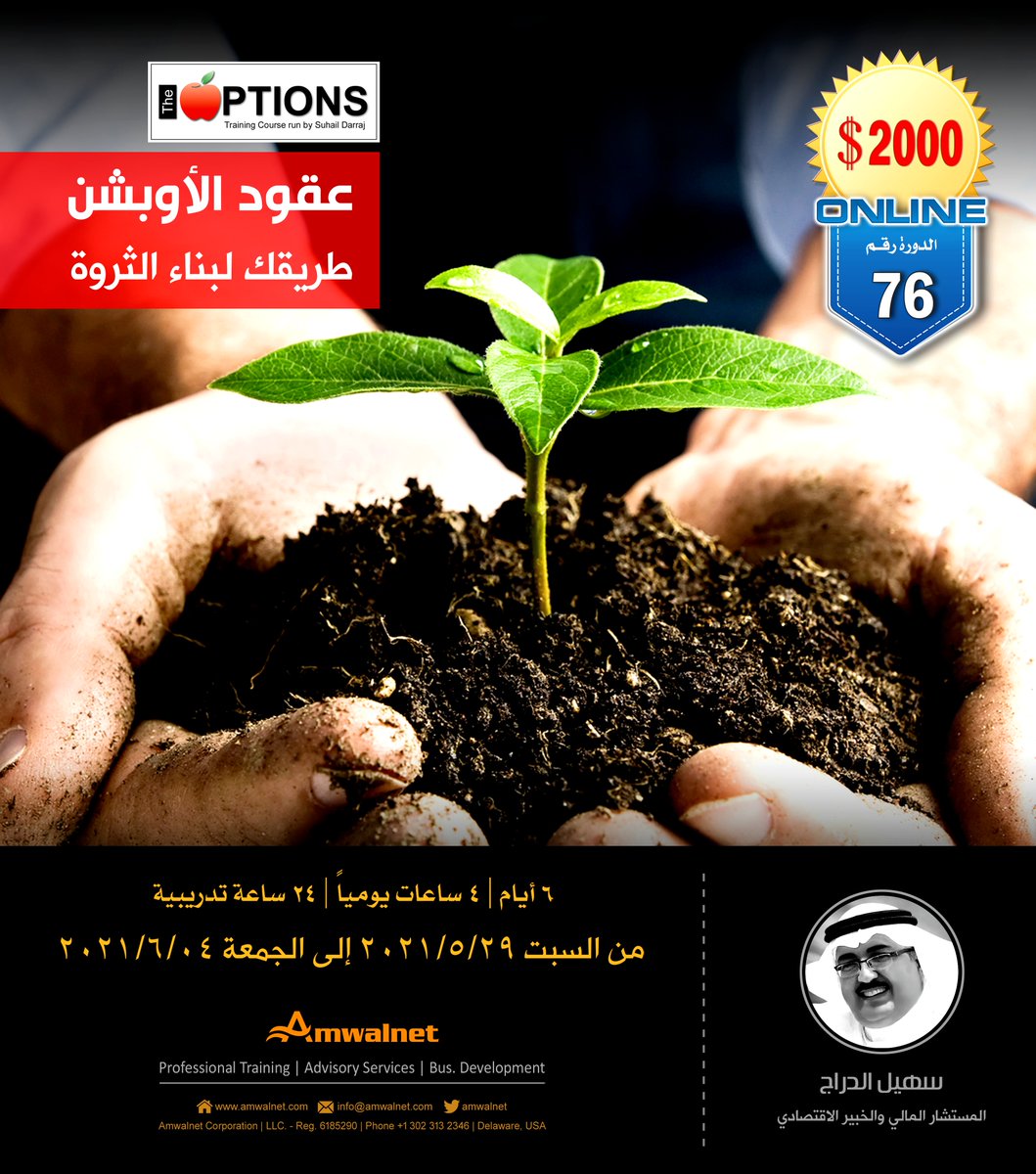 وقت انعقاد دورة (عقود الأوبشن.. طريقك لبناء الثروة): من السبت 2021/5/29 الى الجمعة 2021/6/04 وسيكون أخر موعد للتسجيل هو الثلاثاء 2021/5/18 ، للراغبين في التسجيل يرجى إرسال الاسم الثلاثي والبريد الإلكتروني والمدينة على الخاص أو الى البريد التالي info@amwalnet.com ، وشكرا للجميع