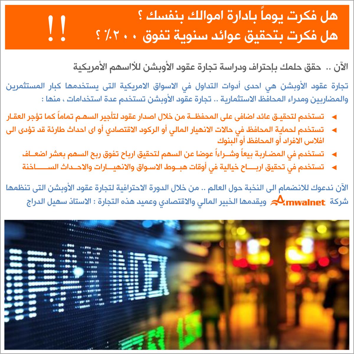 شعار أول دورة لـ #تجارة_الاوبشن باللغة العربية، والدورة هي خلاصة علم وخبرة امتد لأكثر من 22 عاماً في أسواق الأسهم الأمريكية، سهيل الدراج هو أول من ادخل تجارة الأوبشن للوطن العربي، اكثر من 2000 متدرب، لتفاصيل أكثر يرجى الاطلاع على النشرة التعريفية هنا : bit.ly