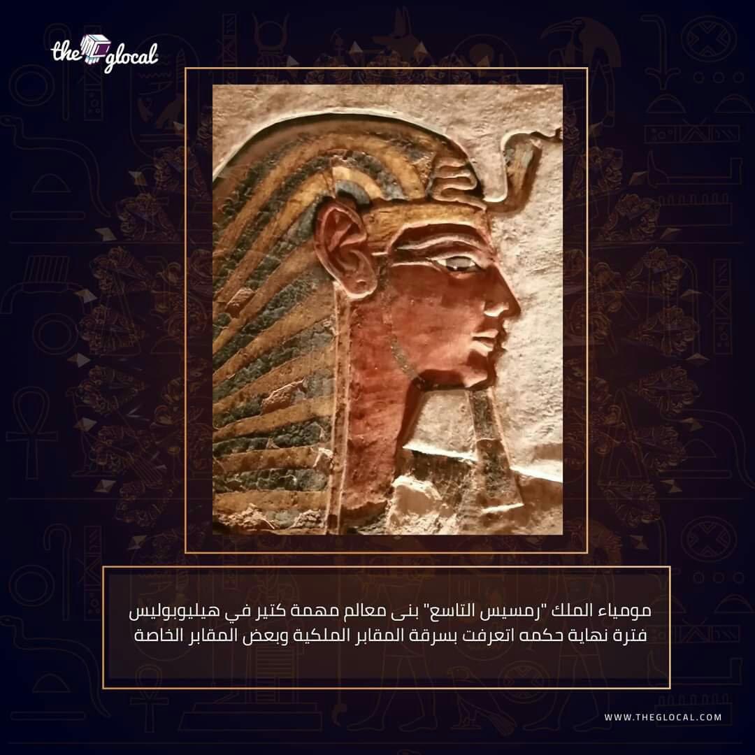 الملك رمسيس التاسع هو حفيد الملك رمسيس الثالث، وهو ثامن ملوك الأسرة العشرين، وكانت مساهماته الرئيسية في معبد الشمس في هليوبوليس، كما قام بتزيين الجدار الشمالي للصرح السابع لمعبد آمون رع بالكرنك .