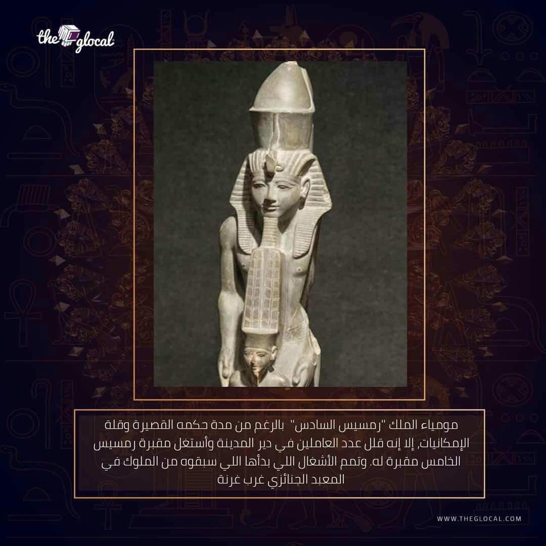 الملك رمسيس السادس هو أحد أبناء رمسيس الثالث، حكم لمدة ثماني سنوات، وتم العثور على مومياء الملك عام ١٨٩٨ في مقبرة أمنحتب الثاني (KV 35) بوادي الملوك بالأقصر.