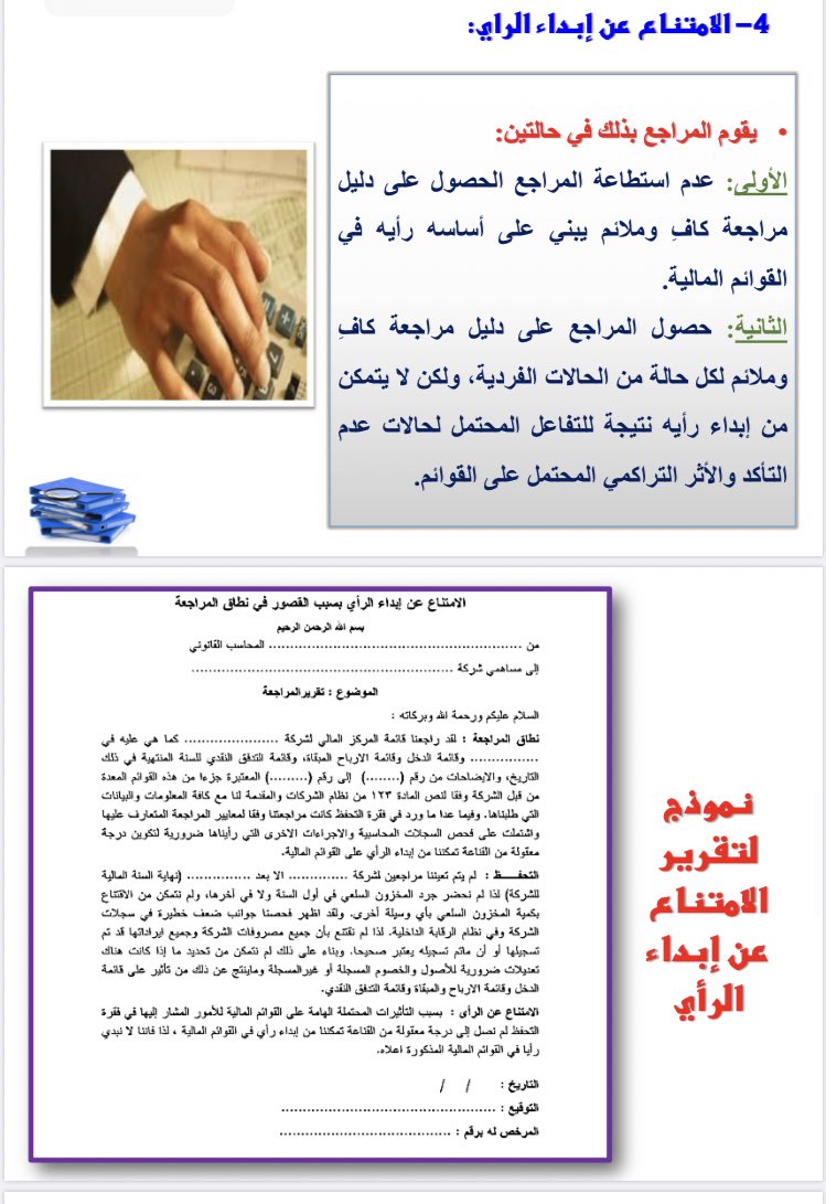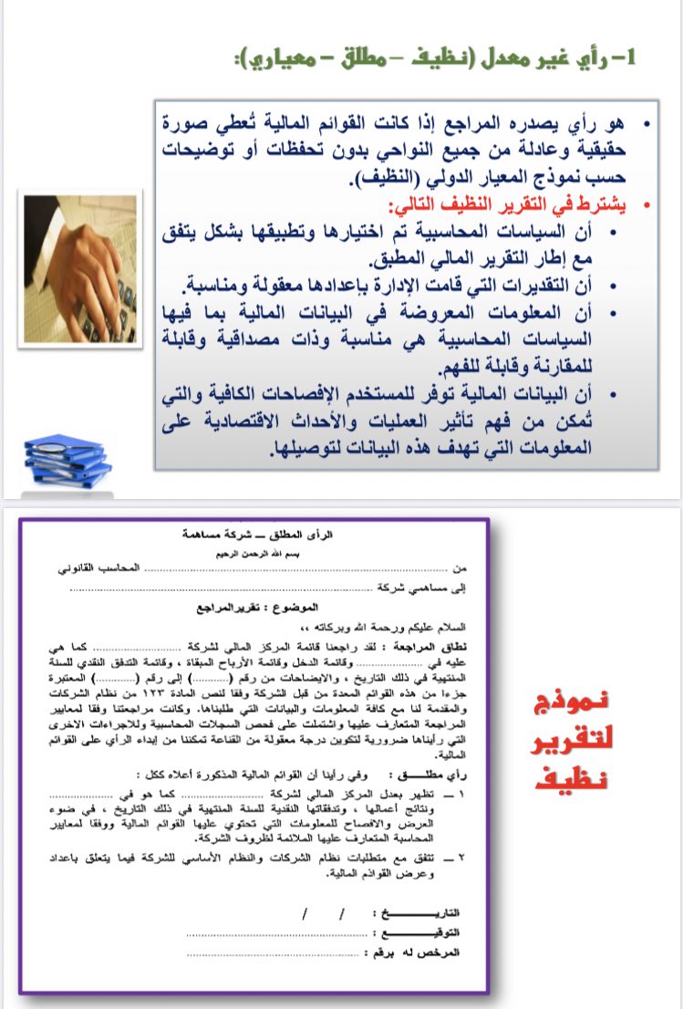📝 ثريد للمراجعين | أنواع التقارير المعبرة عن أراء المراجعه و نموذج عن كل تقرير 👇🏻: