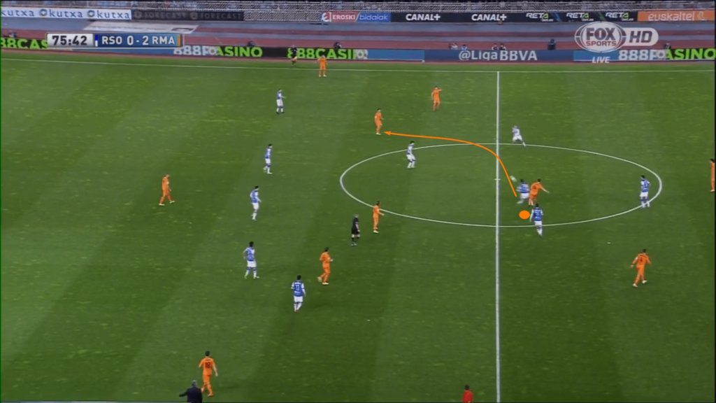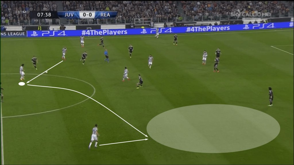 في المواقف التي يجب أن يلعب فيها الريجيستا ضمن هيكل الضغط للخصم ، هناك تفاهم على أنه قد لا يكون لديهم الوقت أو المساحة اللازمة لقيادة تلك التمريرات القطرية الطويلة التي تتجاوز الدفاع. ومع ذلك ، يمكن للاعبين مثل بيرلو ، كما ترون في المثال التالي.