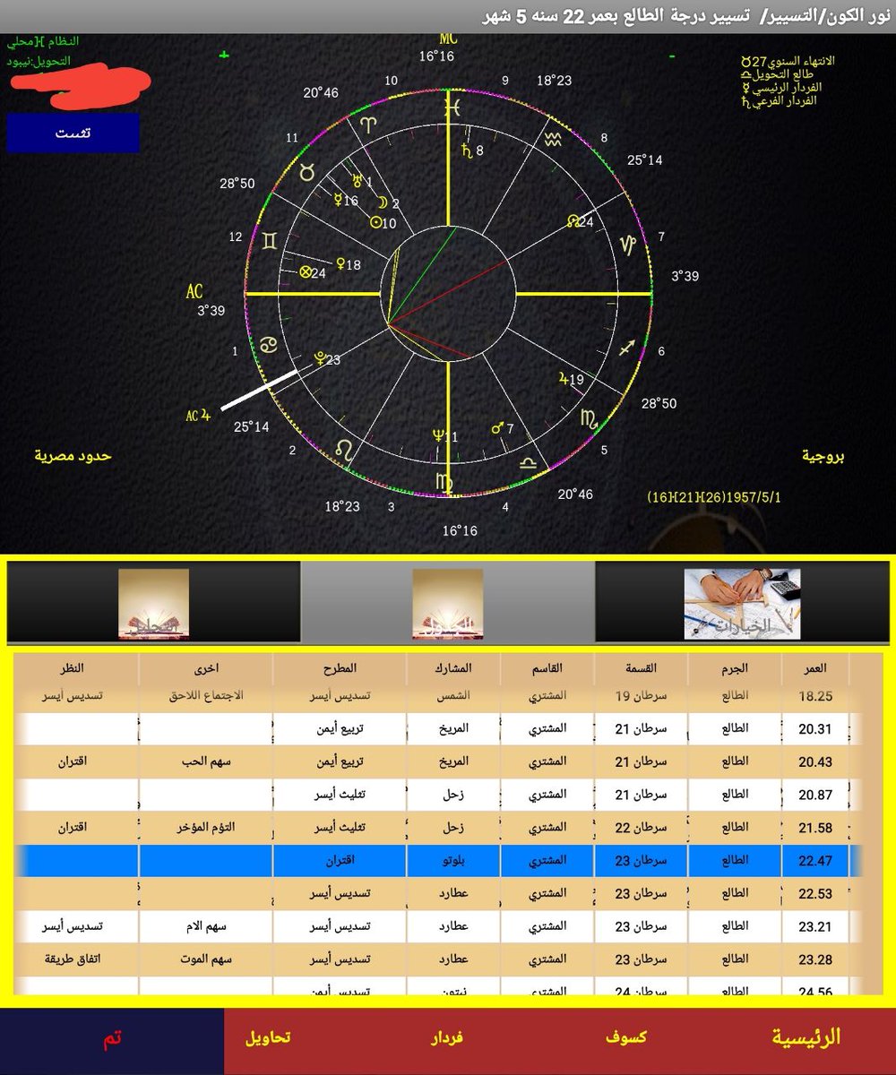 ننظر للانتهاء نراه في ١٢ وحاكمه عطارد وهو حاكم الفردار والاناريتا( حاكم حد السابع عطارد ويعتبر من قواطع الحياة ) واقرب للعداوه ومنتحس في المولد . فنقول غالبا سنته صعبه لنرى التحويل.نرى زحل بدرجة الطالع وهو عدو ومقارن للمريخ بالتحويل فهذه دلالة خطر كبير