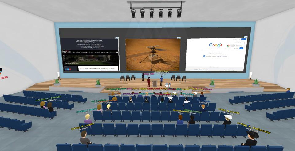 يمكن للحاضرين المشي (أو النقل الافتراضي) بين القاعات المتنوعة للمؤتمرات.