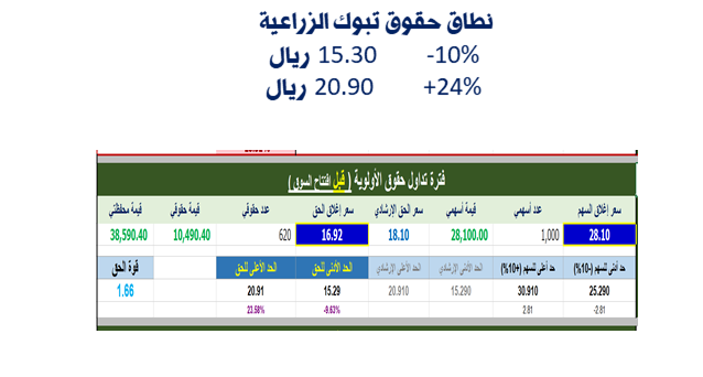 القيمة الاسترشادية للحقوق الآن 17.40 ريال، ومن يشتريها يدفع 10 ريال للاكتتاب.