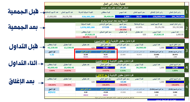 16. يوجد ورقة إكسل سهلة الاستخدام تساعد في رصد حركة الحقوق ومعرفة وضعها أثناء تداول الحقوق، فقط تدخل رأس المال القديم والزيادة وسعر السهم.