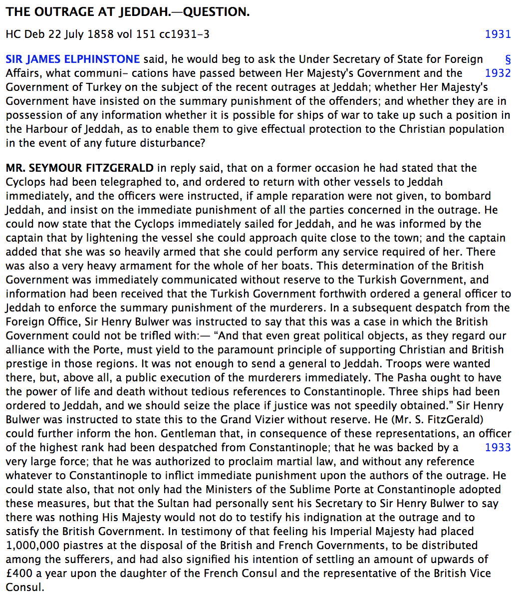 كنت أسأل نفسي ماذا لو تّأخر الموت قلیلاً عن الشریف، ھل كانوا یجرؤون على قتل القنصل الإنكلیزي؟ حتّى عندما مرض الشریف مرضه الذي أدى به إلى الموت بقي ھناك في جدة حیث یمكن أن یجد الأطباء من بین الحجاج والمعتمرین القادمین من شتى بقاع الأرض فیصفوا له العلاج تلو العلاج(8)
