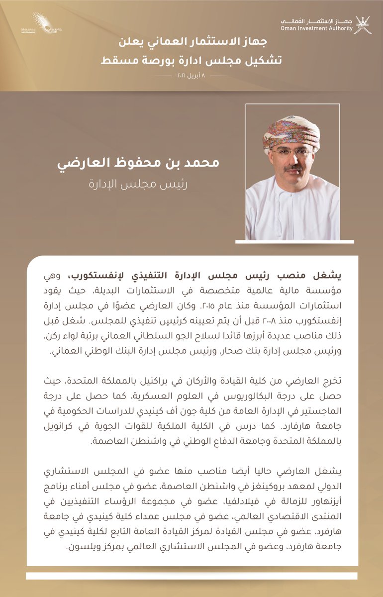 كما يضم المجلس في تشكيله كفاءات وطنية بينهم ممثلين لـ #جهاز_الاستثمار_العماني تتنوع خبراتهم بين الجوانب الأكاديمية وسوق المال المحلي وكبار المستثمرين والبحوث الاستثمارية والاقتصادية وإدارة الاستثمارات، مما سيسهم في تعزيز مسيرة نمو #بورصة_مسقط.
