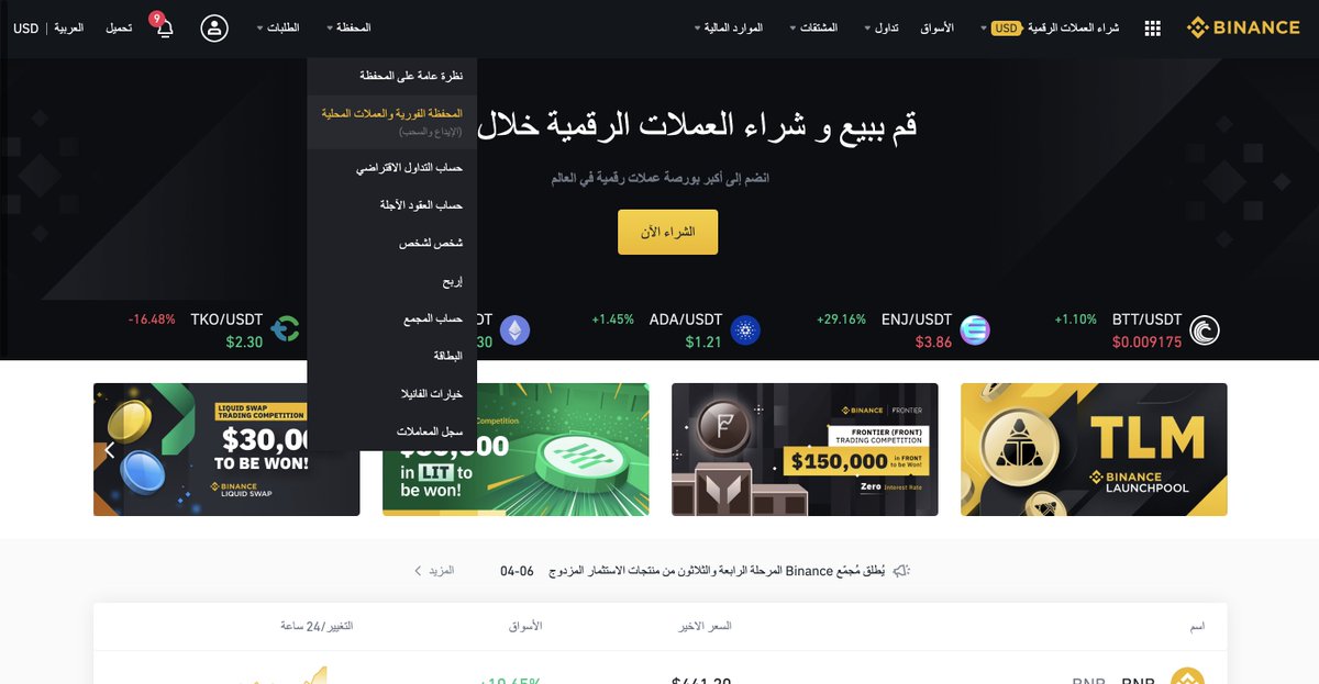 بداية نتوجه الى منصة #بينانس ومن خلال خيار (المحفظة) نختار من القائمة المنسدلة (المحفظة الفورية والعملات المحلية) ثم نتابع