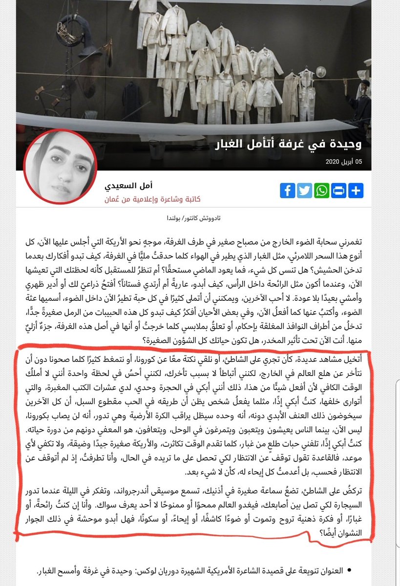 وهو طبعا ليس لها، وإنما للكاتبة العمانية أمل السعيدي وقد نشرته في موقع "ألترا صوت" في 5 إبريل 2020 بعنوان "وحيدة في غرفة أتأمل الغبار":