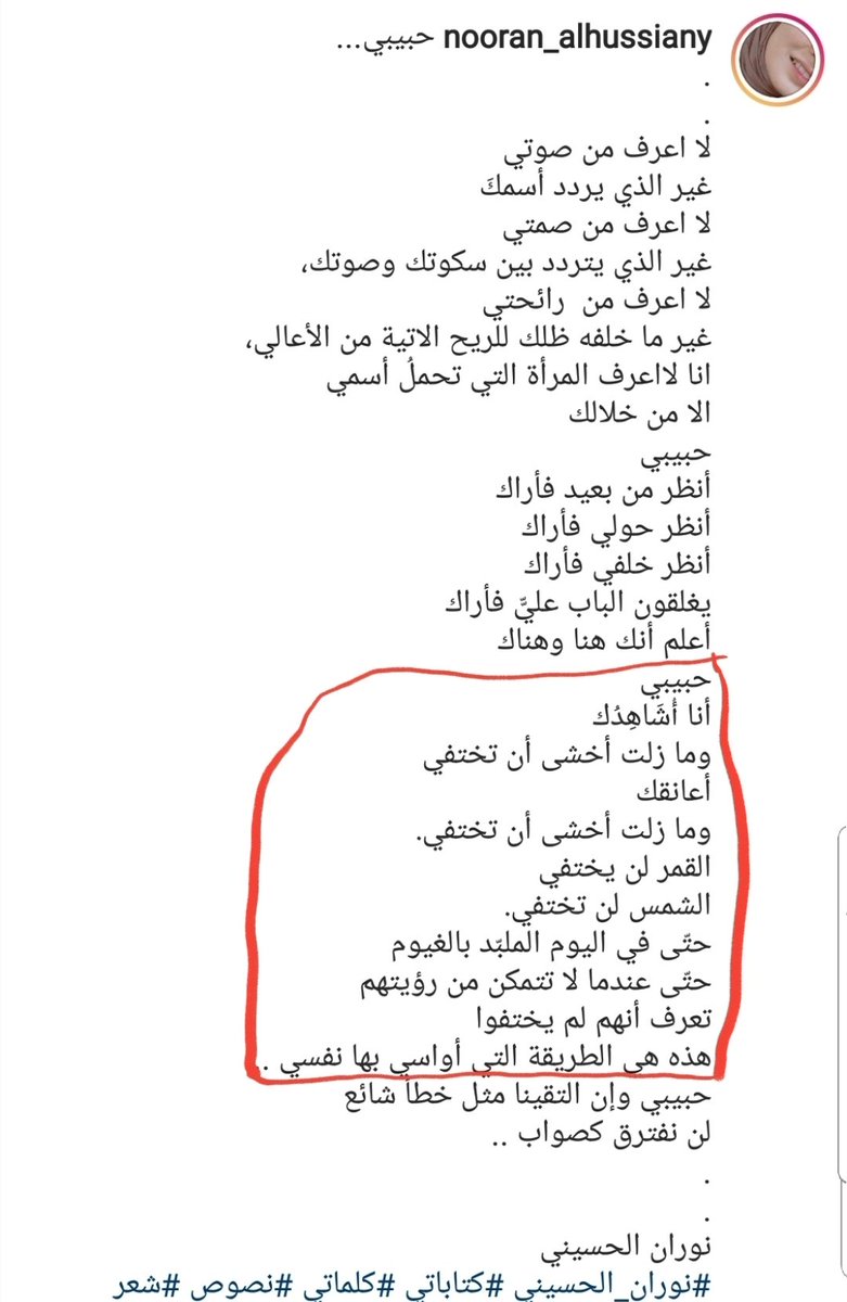 وفي 17 إبريل 2020 نشرت نوران الحسيني على صفحتها في إنستجرام النص (على يمين الصورة) :