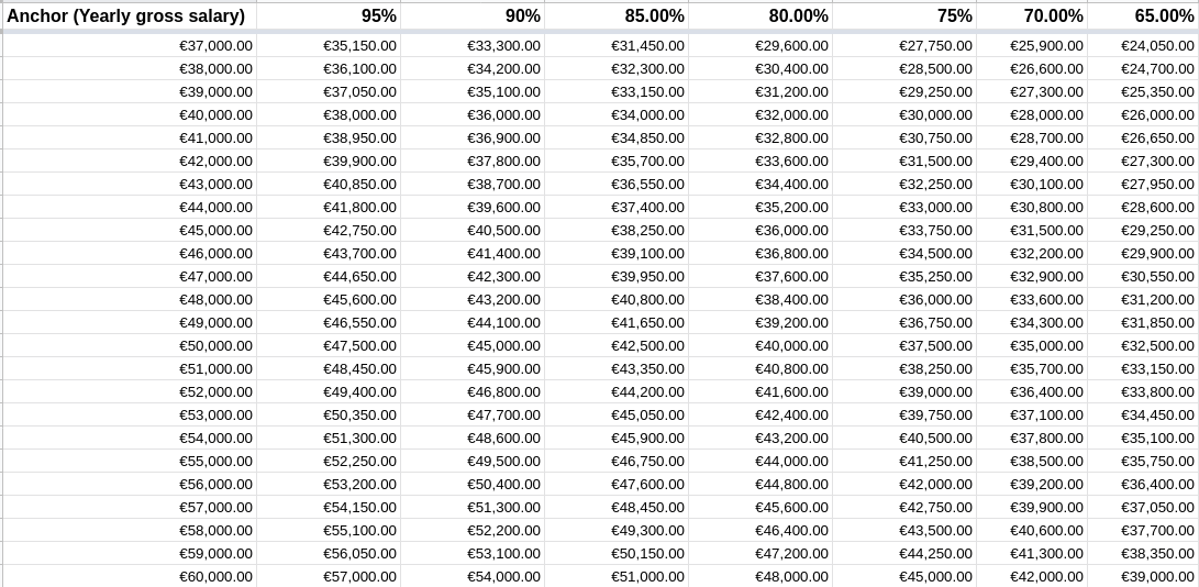 أنا بستعمل الشيت عشان أحدد هبدأ من كام لو اضطريت أنا اللى أقول الرقم. مثلا لو انت المرتب المثالى ليك 85 يورو ومتوقع الريكروتر يفاصل فى 10-15%. يبقى انت غالبا محتاج تبدأ معاه من 100 عشان لما يفاصل معاك فى 10-15% توصل للى انت عايزه.