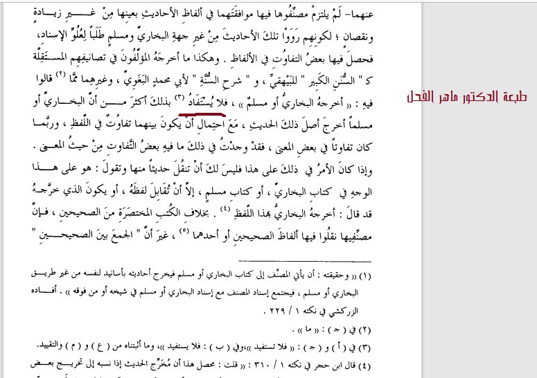 3- أم وأصل أول في أصول فن التحقيق؛ لما تمتاز به من التوثيق البالغ غاية مداه». اهـ. ومع كل ذلك فقد خالفها وأهملها دون ذكر سبب معتبر، وأما الدكتور ماهر الفحل حفظه الله فقد وقع عنده في بعض النسخ: «تستفيد»، وفي البعض الآخر: «يستفيد»، ومع ذلك فقد أثبت الكلمة من مطبوعة الدكتورة بنت