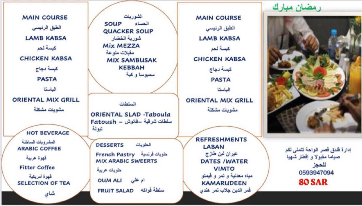 - إفطار في مطعم ملتقى الشرق بـ 280 أو سحور بـ 200.