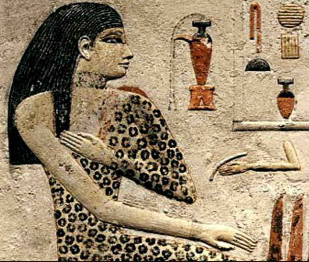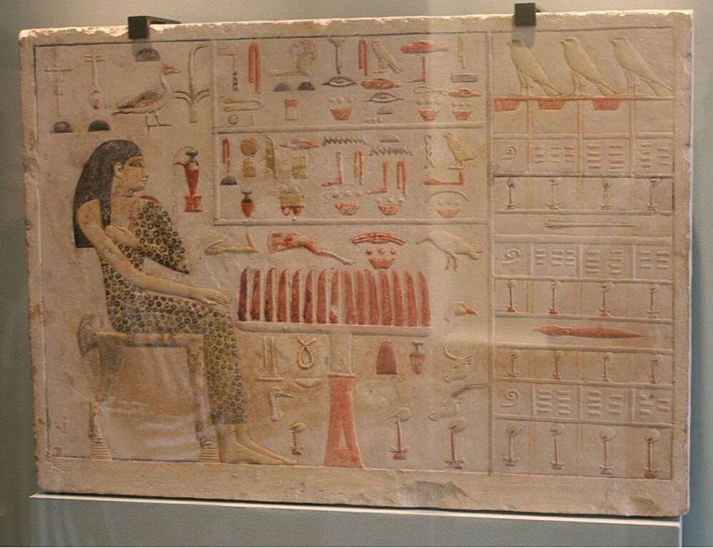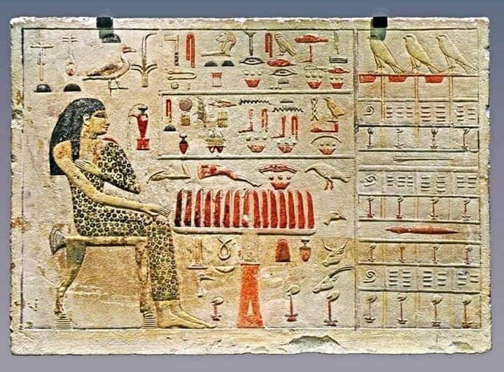 اللوحة بإرتفاع 37.5سم بتصور الأميرة جالسة بتستقبل القرابين وأمامها قائمة بأنواع الأطعمة وقد ارتدت رداء من جلد النمر أو الفهد 👇